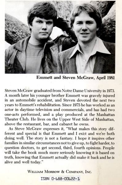 Steve : I recently read "Totaled" , in was in a reader's digest. I was so moved by your story and Emmett, I am doing something I never did before, writing an author or any other celebrity. The scene you depicted with Emmett walking up for Holy Communion had me in tears. You did a wonderful loving thing for your brother and I just wanted to say I wish you well and hope this finds Emmett well as well. Good Luck in all you do..........Beverly Penney..Newfoundland Canada |